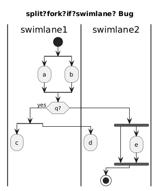 |swimlane1|if(q?) then (yes)|swimlane1| split :c; detach|swimlane2| split again :d; detach end split|swimlane1|else|swimlane2| fork fork again :e; end forkendif