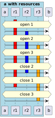 I have the same question. I'm generating a sequence diagram out of instrumentation added to old code in an attempt to understand how it works so I can fix it. I'm using lifelines to show the life span of open-resources, and the resources are not being closed in opposite order that they were opened. I'm color coding the resources. In the example, resource 3 is orange, but the orange lifeline ends when resource 2 is closed because it was the last one opened.