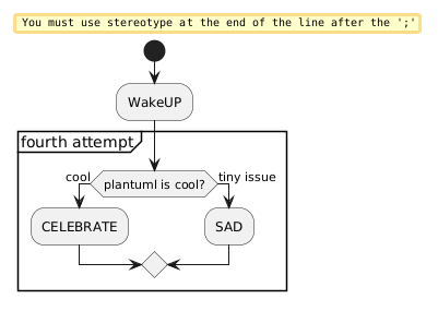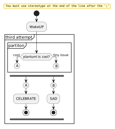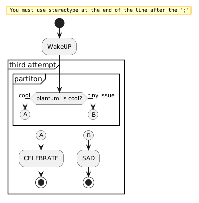 I've noted that because of the structure of the syntax, its impossible to conditionally exit from a partition: all branches of a conditional that starts within a partition must end before the partition ends. Perhaps a break/return statement could be of use. I'm aware of swimlanes, but it did not fit well.