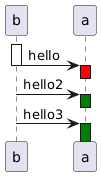 @startuml!pragma teoz trueactivate bb -> a --++ #red : hellodeactivate ab -> a : hello2activate a #greendeactivate ab -> a ++ #green: hello3@enduml
