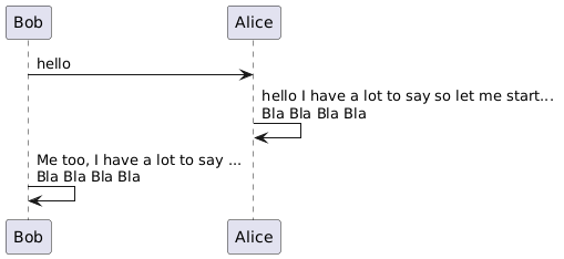 @startuml Bob -> Alice : hello Alice <- Alice : hello I have a lot to say so let me start... \nBla Bla Bla Bla @enduml
