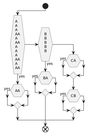 @startuml flowchart skinparam ActivityDiamondFontName Consolas skinparam defaultFontSize 12 skinparam NoteFontName Microsoft Yahei skinparam lengthAdjust none start if ( A A A AA A AA A A A AA A AA ) then (yes) if ( AA ) then (yes) else endif elseif ( B B B B B ) then (yes) if ( BA ) then (yes) else endif else label dummylabel if ( CA ) then (yes) endif if ( CB ) then (yes) else endif endif end @enduml