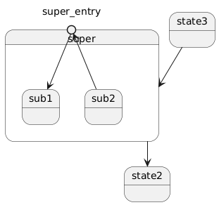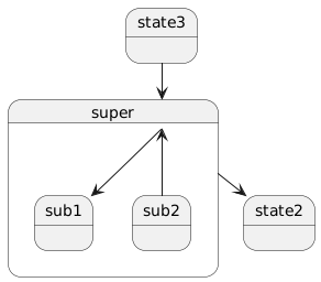 Transitions between super- and sub-states are a bit odd in that they do not terminate at the edge of the super-state, but inside it at some arbitrary spot: http://www.plantuml.com/plantuml/png/SoWkIImgAStDuG8oIb8LYaiBKeiKghaKW00cacI8oZNYgkM2AWUJHiWSOw0Ks0nTNJk8Nf0EC0yiZYIDejiOIOb3QbuAq4a0
