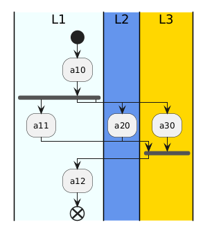 @startuml |#Azure|L1| start :a10; fork :a11; fork again |#CornflowerBlue|L2| :a20; fork again |#Gold|L3| :a30; endfork |L1| :a12; end @enduml