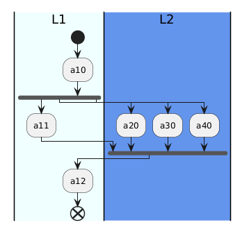 @startuml |#Azure|L1| start :a10; fork :a11; fork again |#CornflowerBlue|L2| :a20; fork again :a30; fork again :a40; endfork |L1| :a12; end @enduml