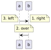 a->b note right : 1. right note left : 3. left note over a,b : 2. over a<-b
