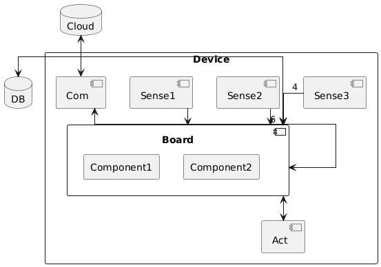 rectangle Device { component Com component Board { rectangle Component1 rectangle Component2 } component Sense1 component Sense2 component Sense3 component Act}