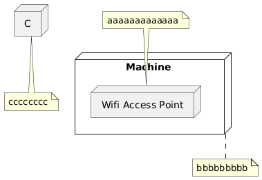 @startuml bug NoteNode CNode "Machine " as M { Node "Wifi Access Point" as WifiAP}Note top of WifiAP: aaaaaaaaaaaaaNote bottom of M : bbbbbbbbbNote bottom of C : cccccccc@enduml